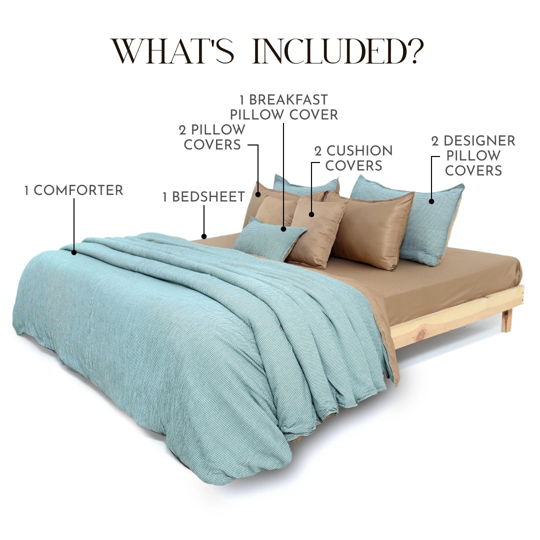 ZARF Italian Staple Weave Comforter With 2 Designer Pillow Cases, 2 Solid Pillowcases & 2 Cushion Covers - Pine