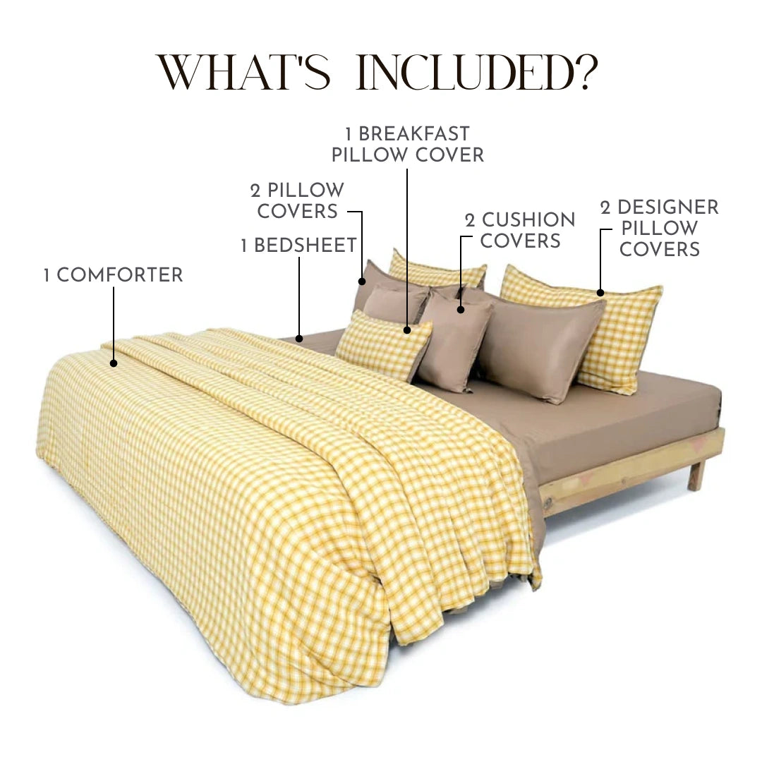 Indulge in luxury with the ZARF Linen blend Weave 9-Piece Bedding Set. This elegant set includes a comforter, bedsheet, 2 designer pillowcases, 2 pillowcases, 1 breakfast cushion cover and 2 cushion covers, bringing effortless sophistication to your space. Made from premium linen blend and Italian staple weave fabric with ZarfCloud™ Micro Vegan Flanette fill, it offers cloud-like softness and year-round comfort.