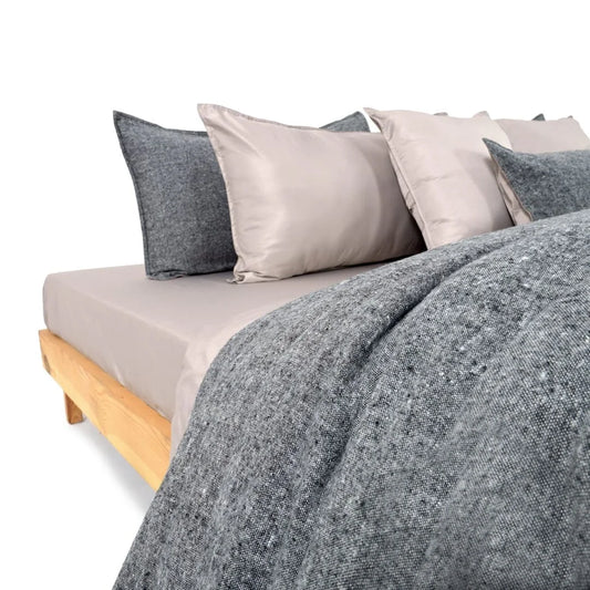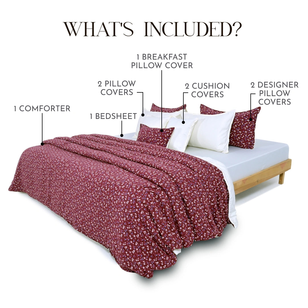 Indulge in luxury with the ZARF Linen blend Weave 9-Piece Bedding Set. This elegant set includes a comforter, bedsheet, 2 designer pillowcases, 2 pillowcases, 1 breakfast cushion cover and 2 cushion covers, bringing effortless sophistication to your space. Made from premium linen blend and Italian staple weave fabric with ZarfCloud™ Micro Vegan Flanette fill, it offers cloud-like softness and year-round comfort.
