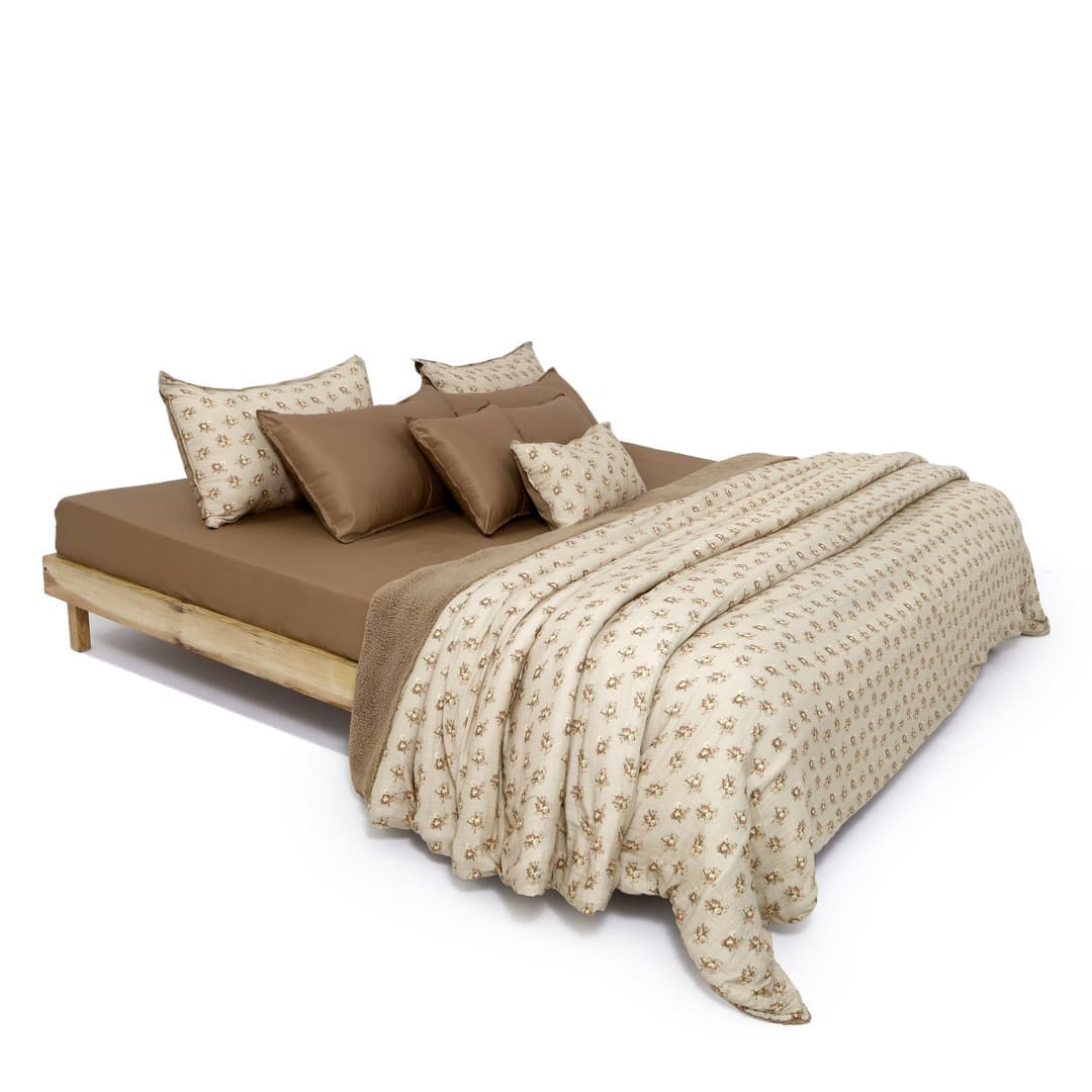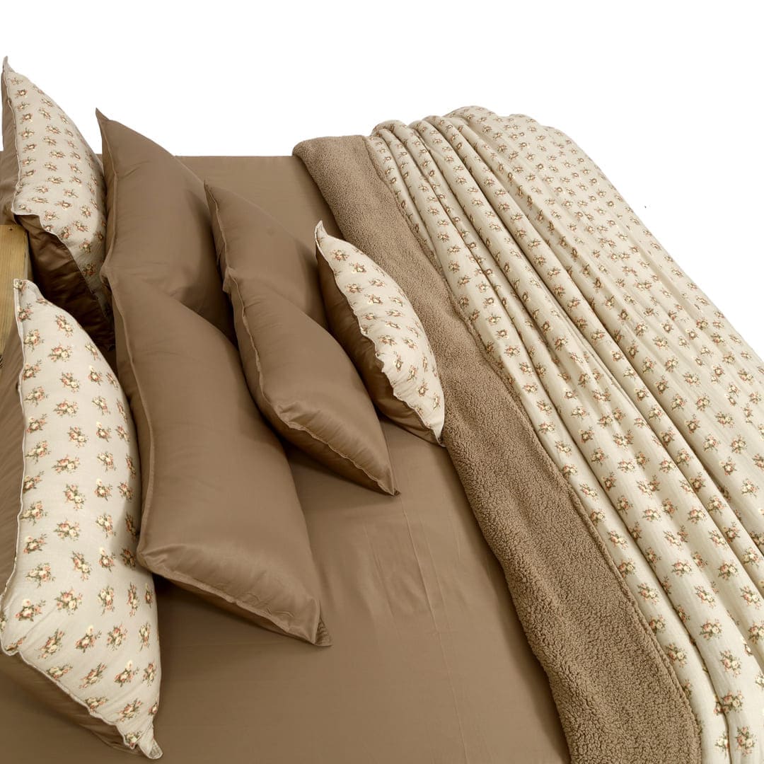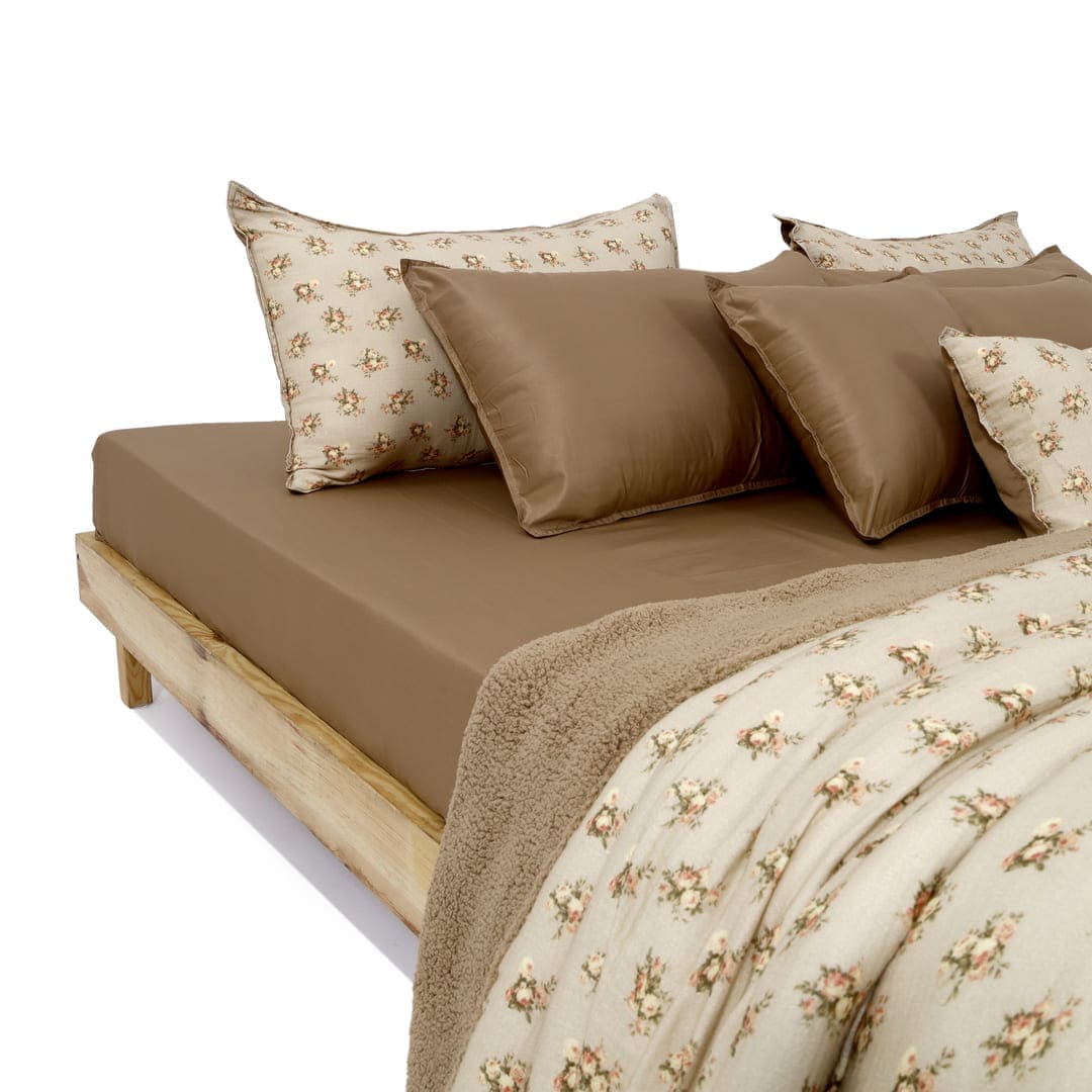 ZARF Italian Staple Weave Bedsheet With 2 Designer Pillow Cases, 2 Solid Pillowcases & 2 Cushion Covers - Caramel