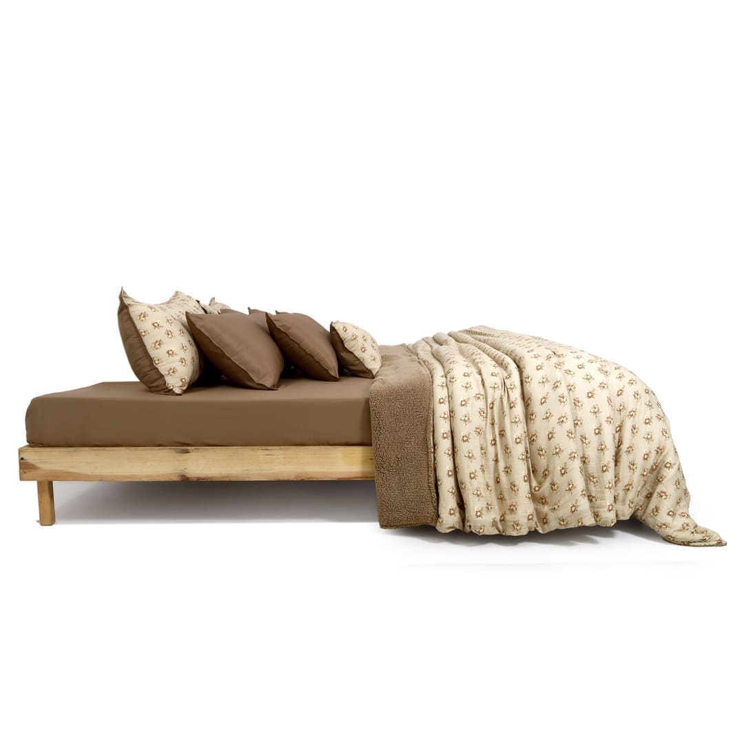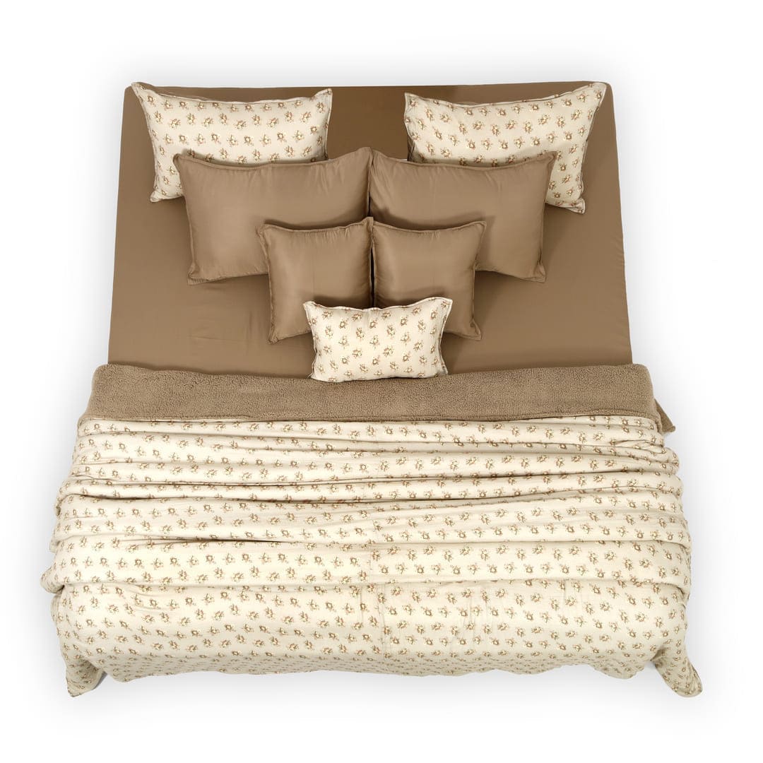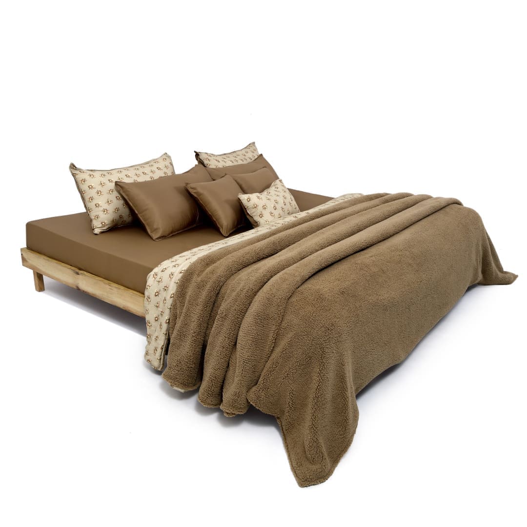 ZARF Italian Staple Weave Bedsheet With 2 Designer Pillow Cases, 2 Solid Pillowcases & 2 Cushion Covers - Caramel